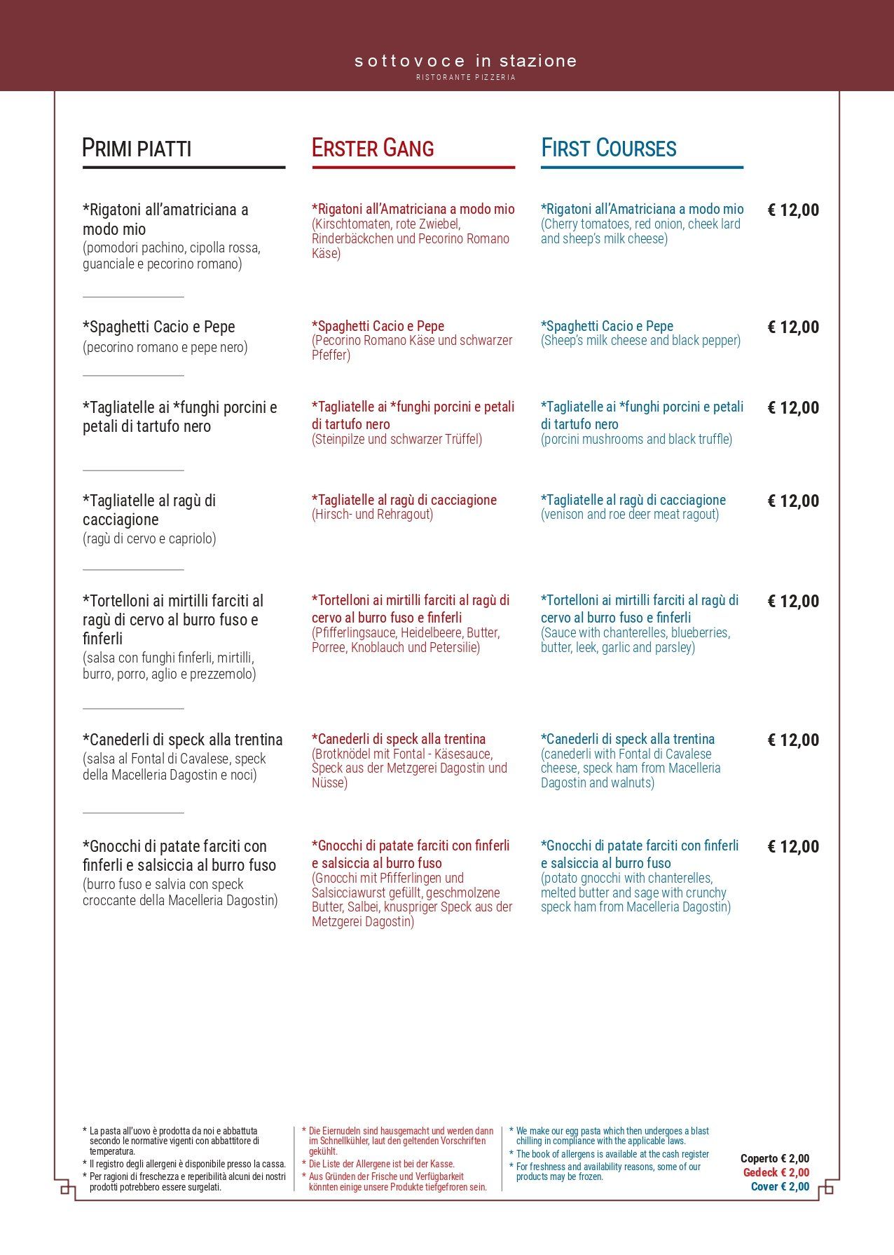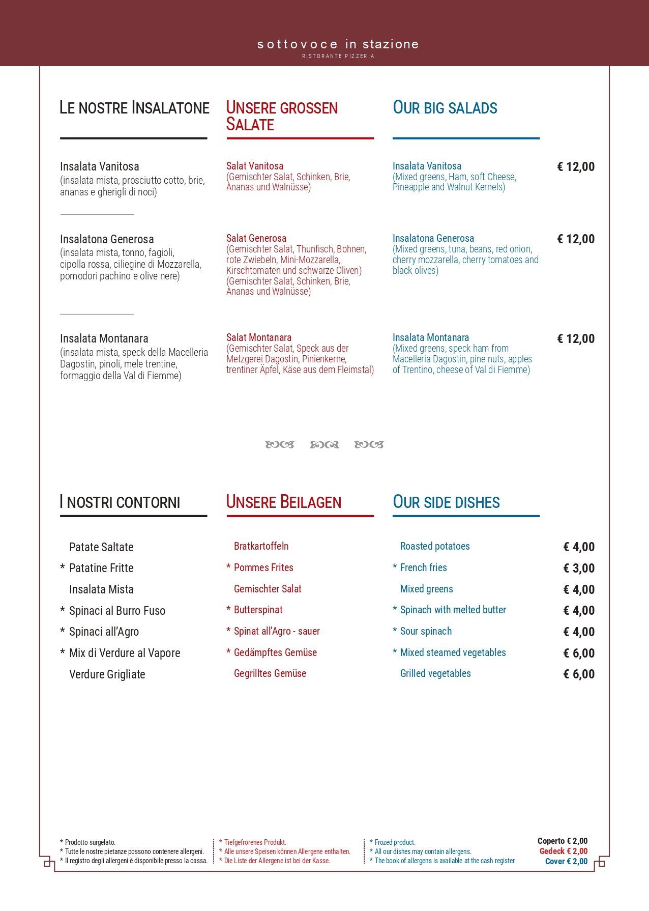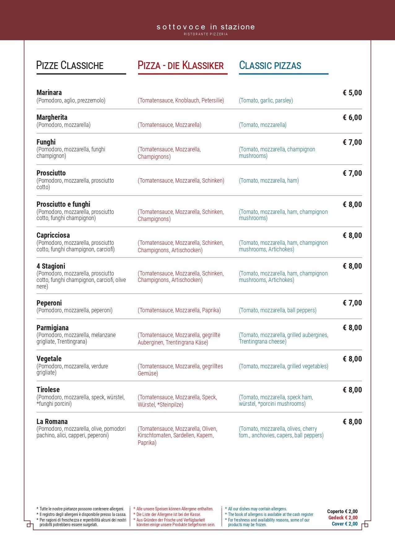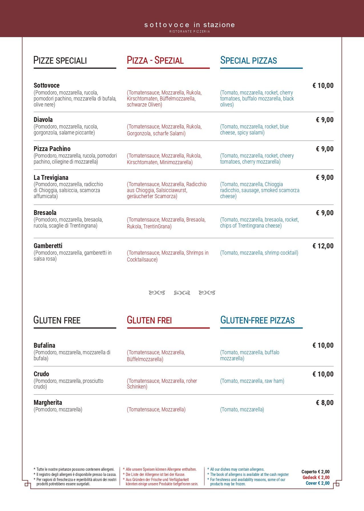 Cerchi un ristorante o una pizzeria che vanti un menu adatto a tutti i gusti e tutte le esigenze? Qui da Sottovoce in Stazione sapremo accontentarti! Il nostro ventaglio di proposte spazia dalla pizza romana alle specialità tipiche romane, come ad esempio la carbonara o l'abbacchio fino: questo si deve alle origini dei nostri titolari, che hanno portato fin qui il meglio della loro città di origine. Ma non possono mancare le pietanze trentine! Soffri di allergie o intolleranze? Faremo il possibile per venirti incontro: rivolgiti a noi e troveremo assieme una soluzione!