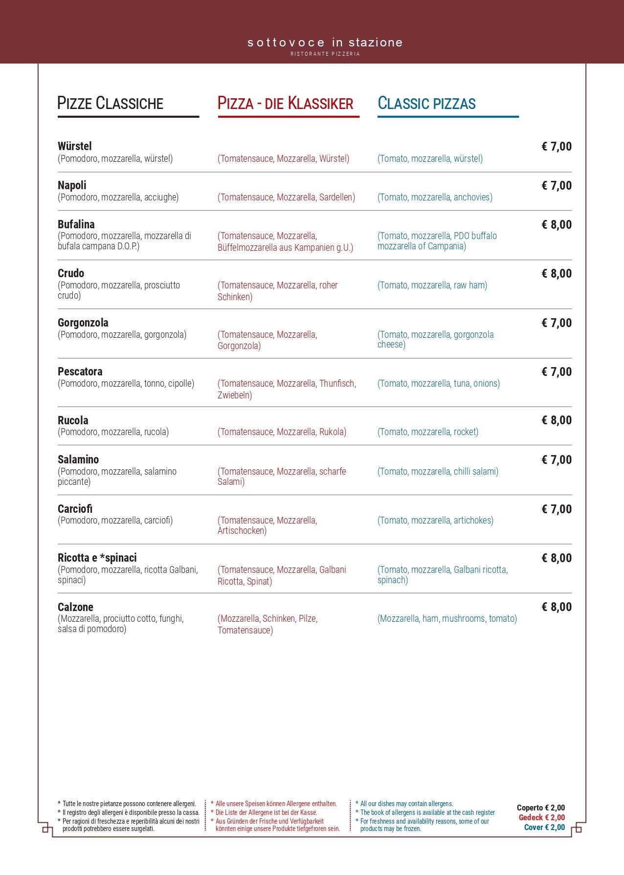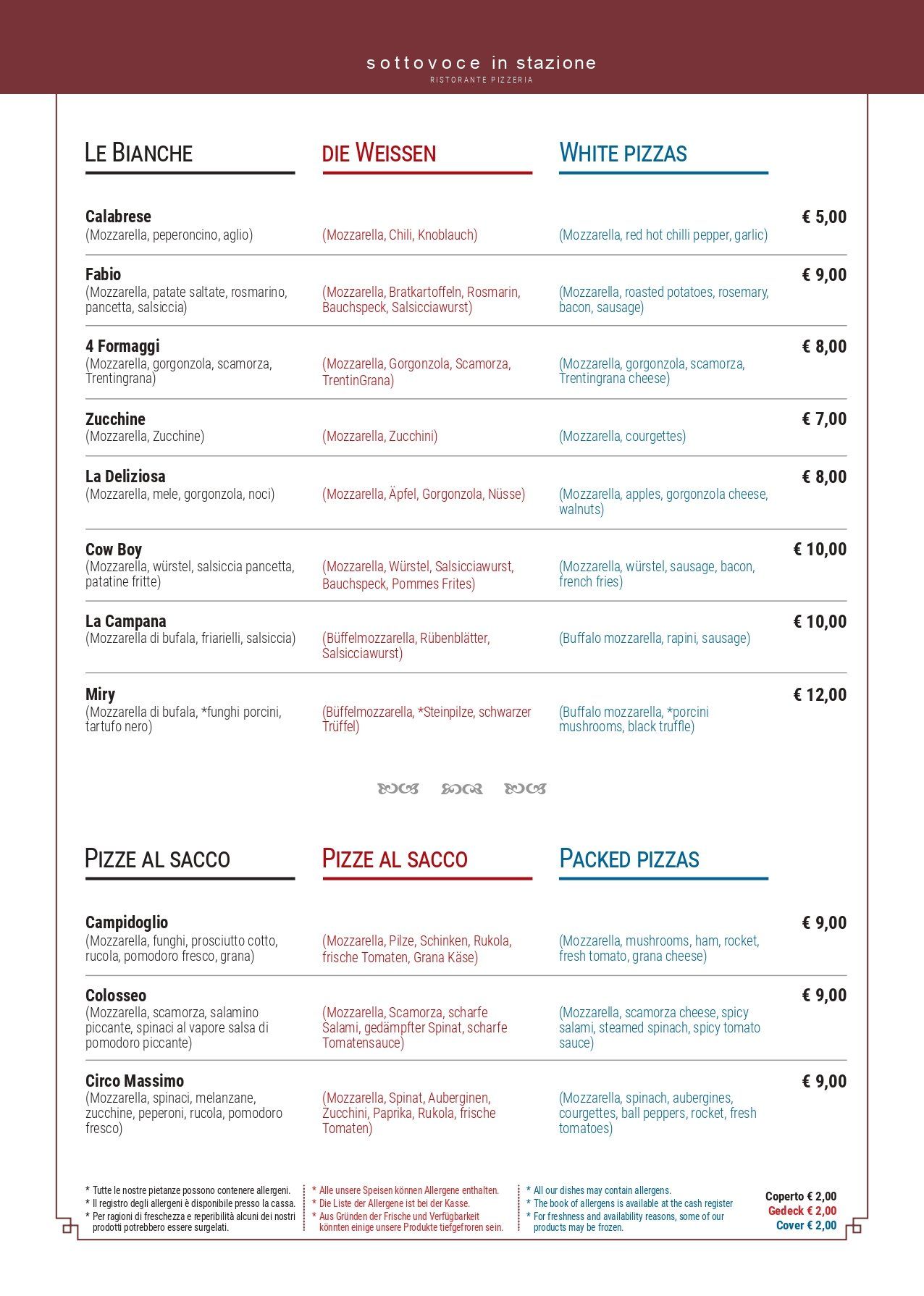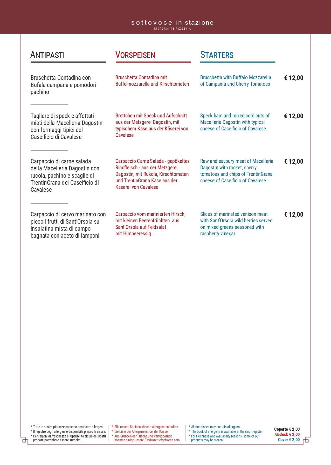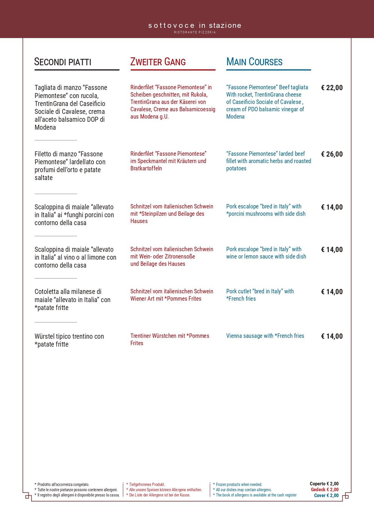 Cerchi un ristorante o una pizzeria che vanti un menu adatto a tutti i gusti e tutte le esigenze? Qui da Sottovoce in Stazione sapremo accontentarti! Il nostro ventaglio di proposte spazia dalla pizza romana alle specialità tipiche romane, come ad esempio la carbonara o l'abbacchio fino: questo si deve alle origini dei nostri titolari, che hanno portato fin qui il meglio della loro città di origine. Ma non possono mancare le pietanze trentine! Soffri di allergie o intolleranze? Faremo il possibile per venirti incontro: rivolgiti a noi e troveremo assieme una soluzione!
